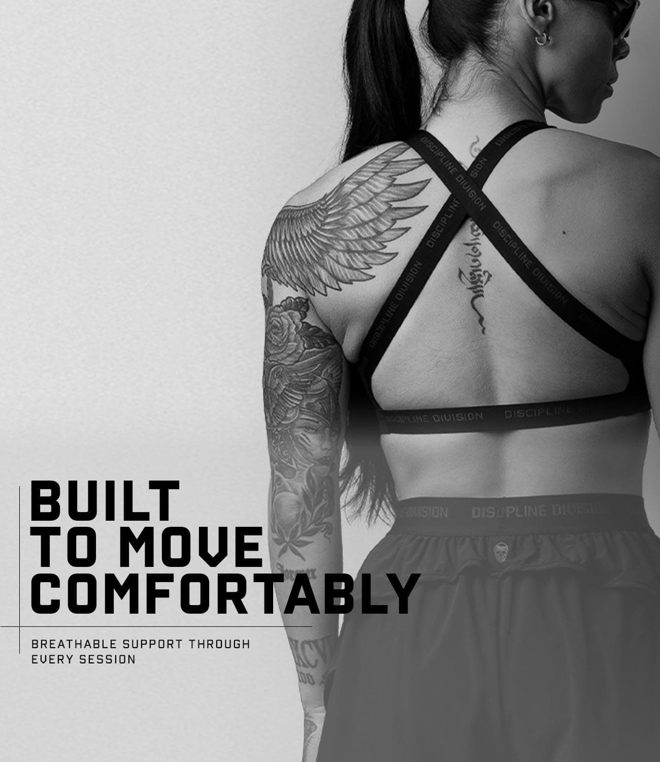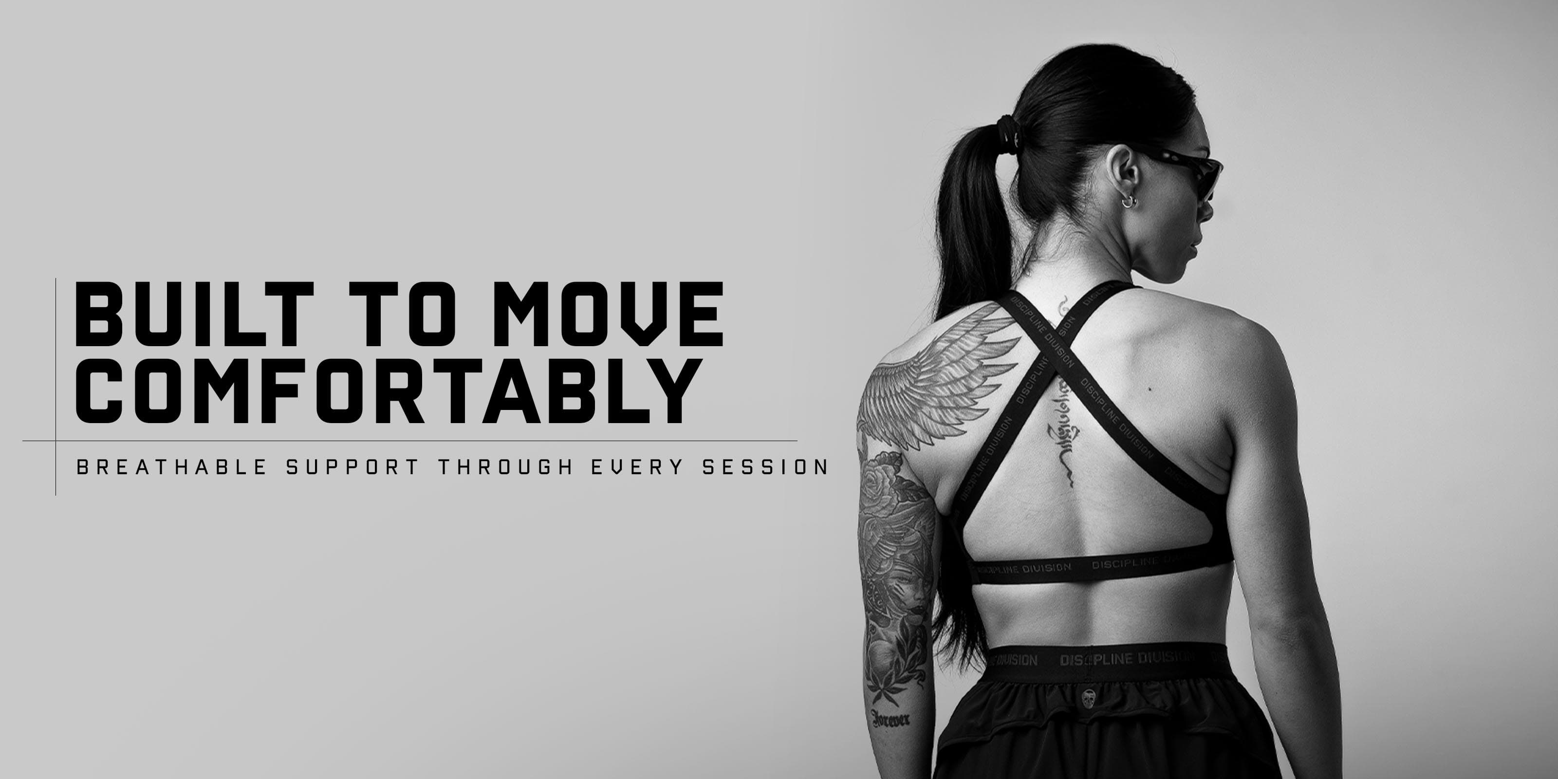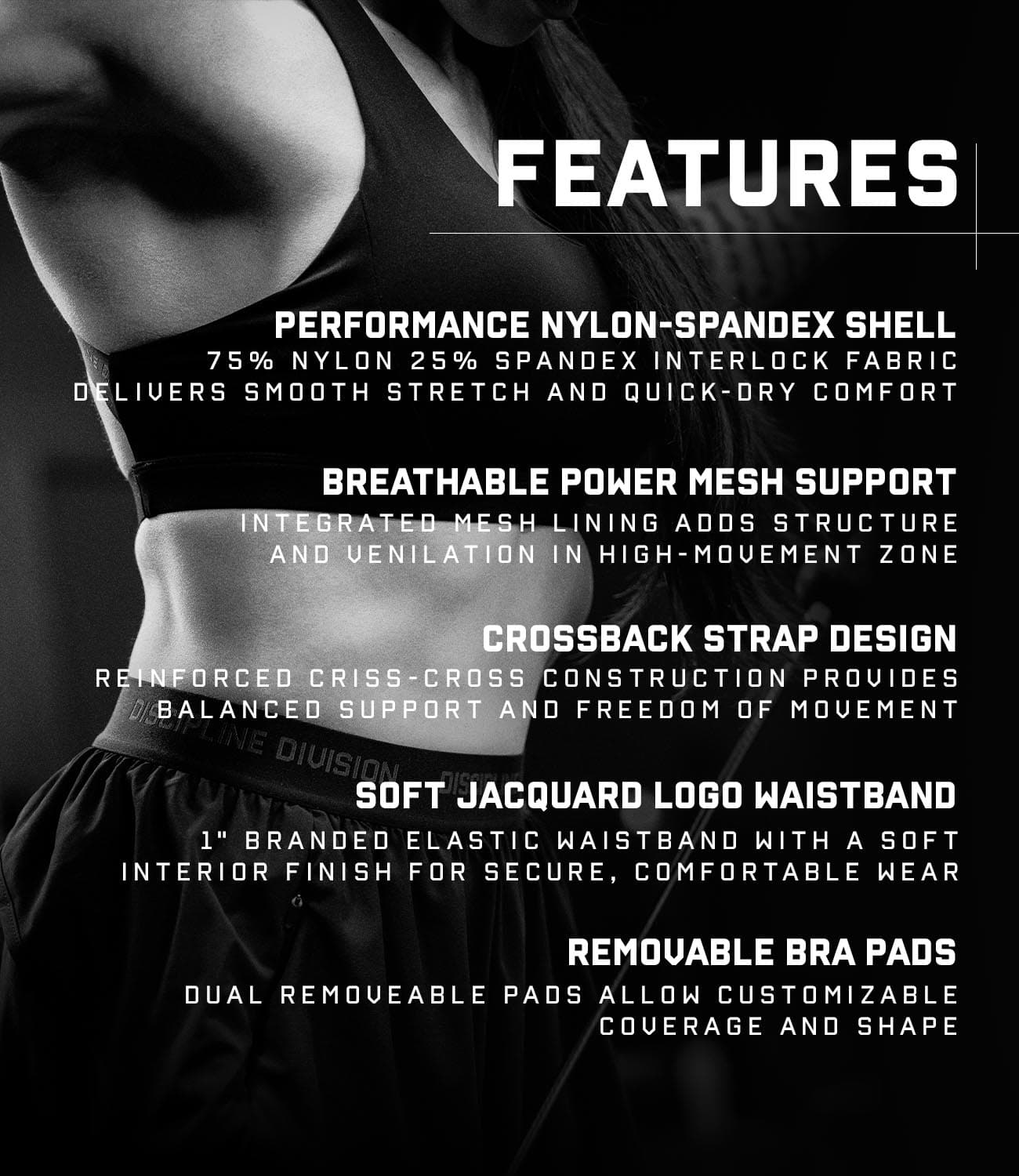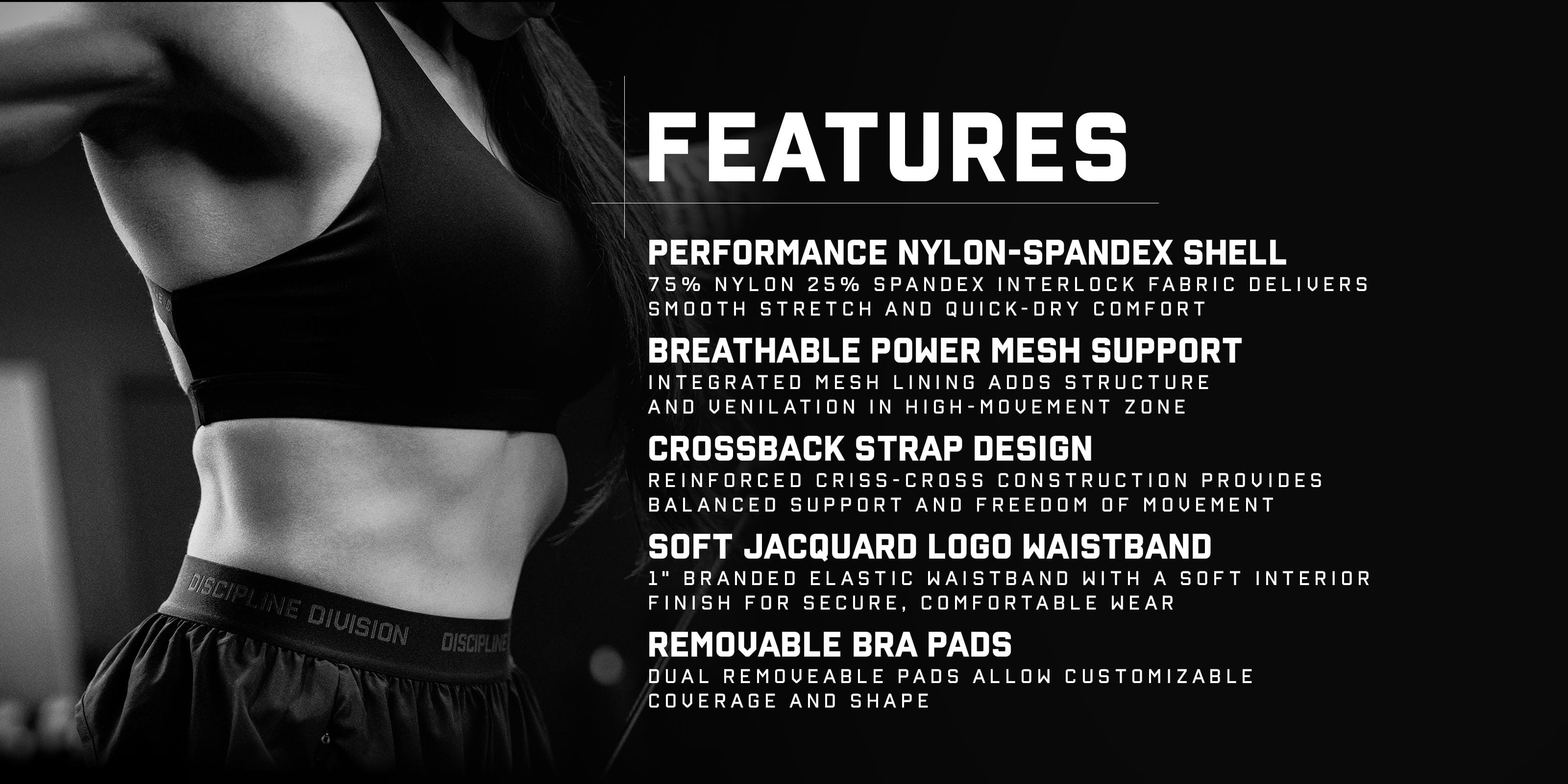 Crafted from a quick-drying nylon-spandex performance fabric and reinforced with breathable power mesh lining, this bra balances support and mobility while maintaining a clean, elevated look that reflects the Discipline Division mindset—commitment above all else.