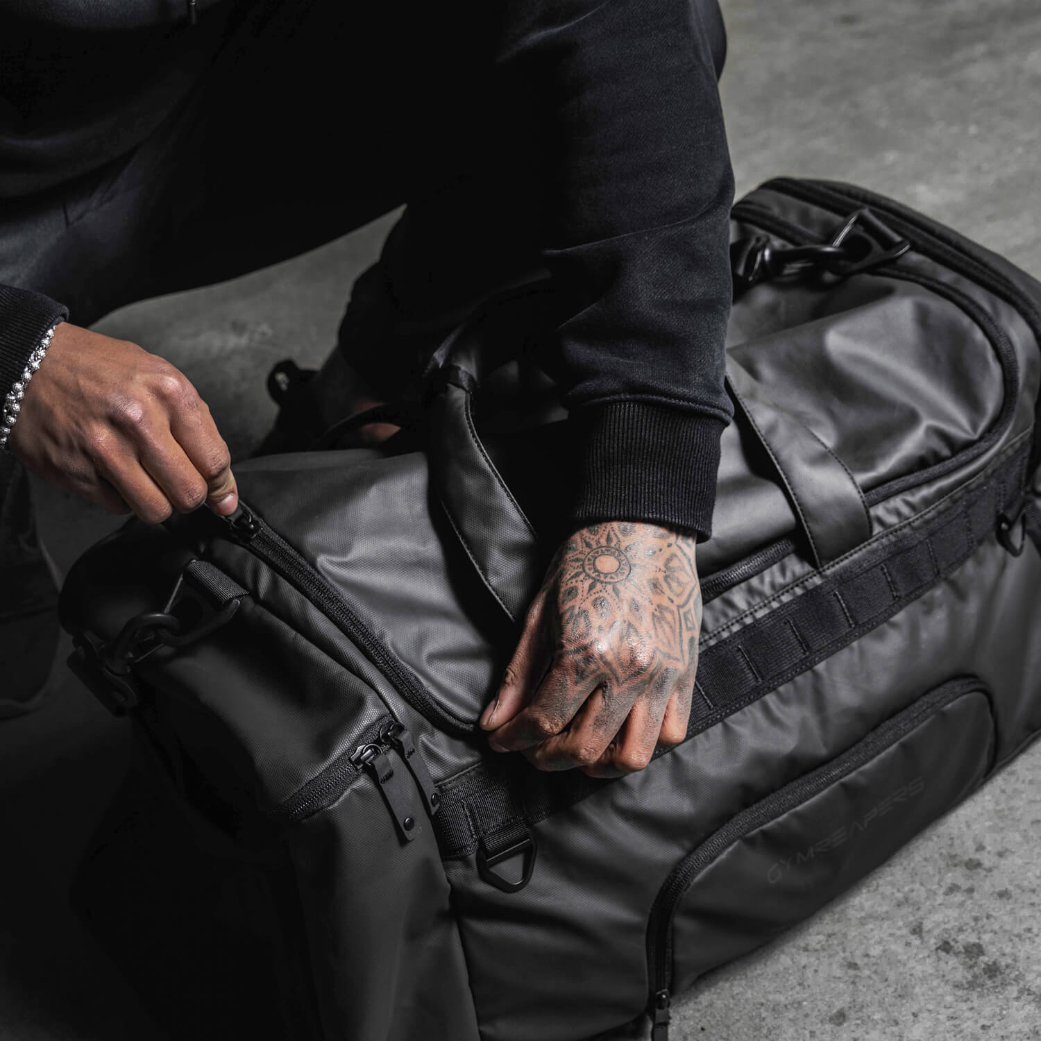 The Gravestone Duffle’s look is perfected with double-layered nylon Molle and fixed D-Ring attachments on both ends, leaving room to clip keys and your sleeve strap. Never throw your sweaty sleeves inside your bag again.